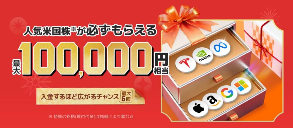 新規口座開設&入金で最大10万円相当の人気株(買付代金)が必ずもらえます!