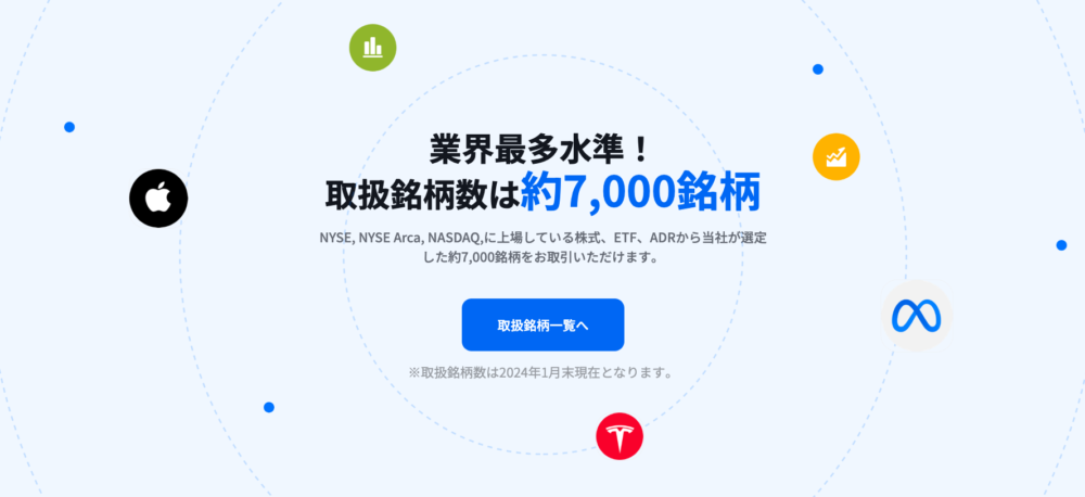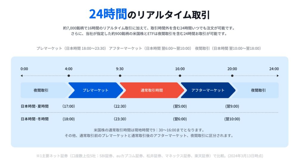 ウィブル証券が指定した約900銘柄の米国株とETFは夜間取引を含む24時間お取引が可能です。