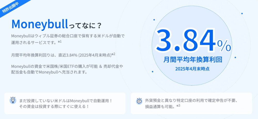 Moneybullとは: 証券口座内の米ドルを自動で外貨建てMMF(マネー・マーケット・ファンド)に投資してくれるサービスです。